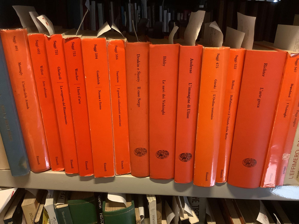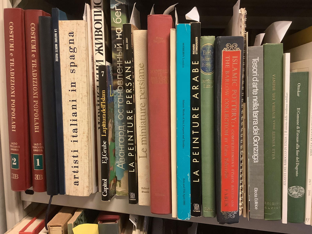 The library/studio on the ground floor of Palazzo Piatti is made up of two rooms with 102 linear metres of shelving containing books in several languages while an upper level houses collections of magazines and catalogues collected over several generations.